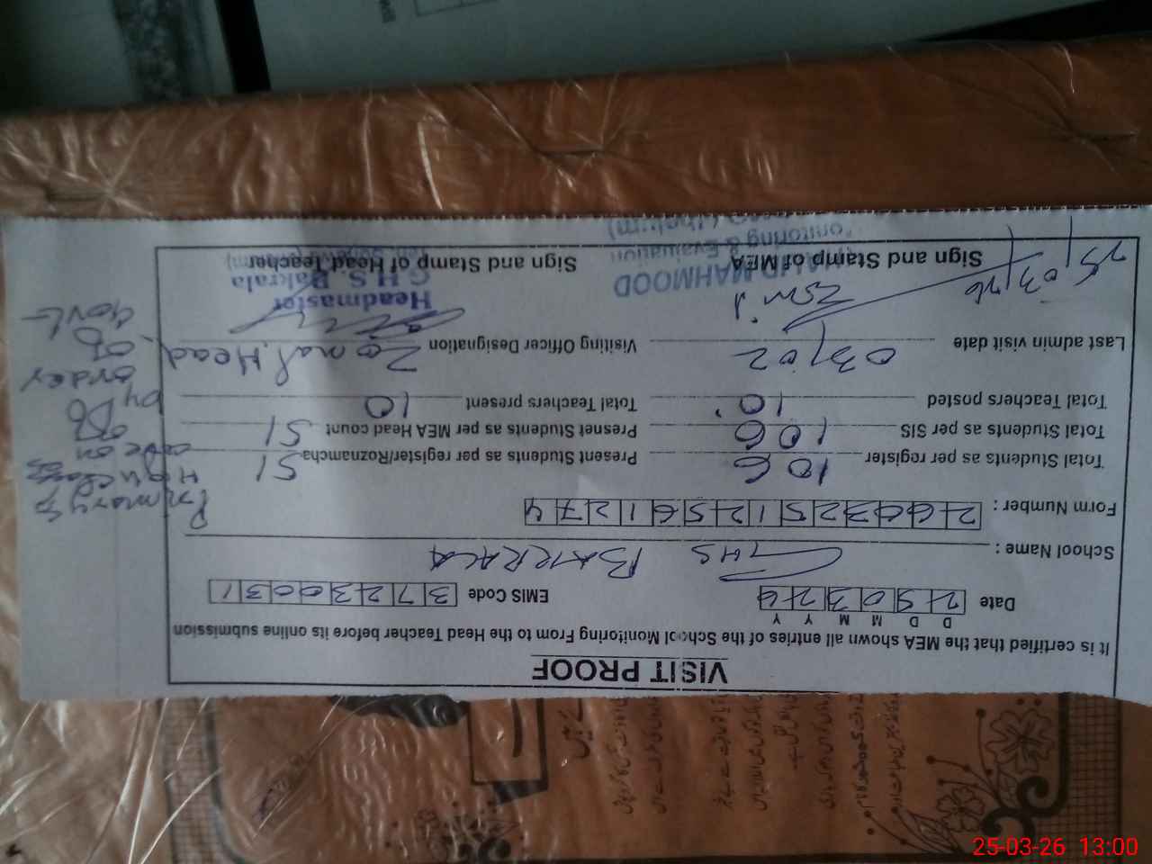 | Attendance Register | Head Teacher | MEA with School | Visit Proof |
