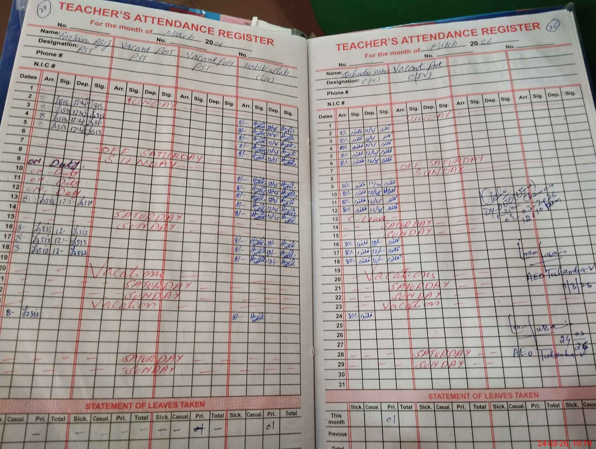 | Leave | Duty | Absent | Maternity | Medical | Ex- Pak |