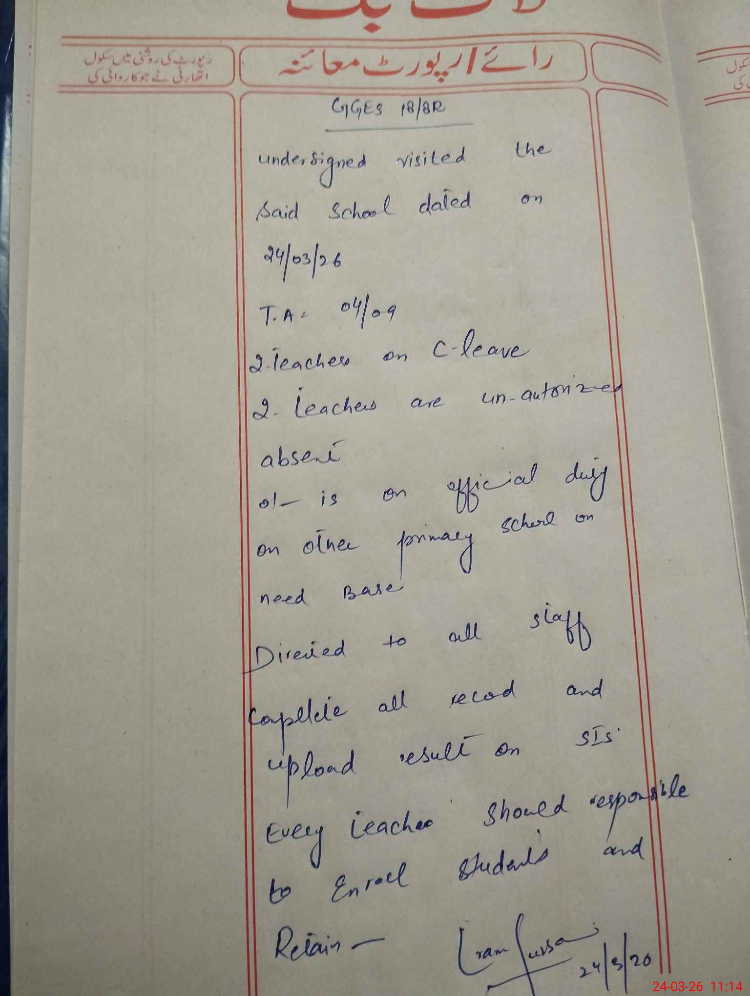 | Attendance Register | Head Teacher | MEA with School | Visit Proof |