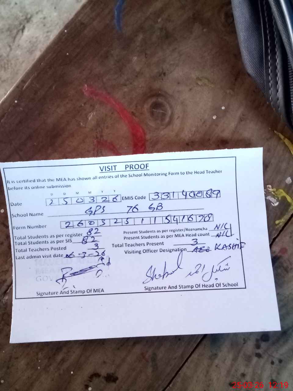 | Attendance Register | Head Teacher | MEA with School | Visit Proof |