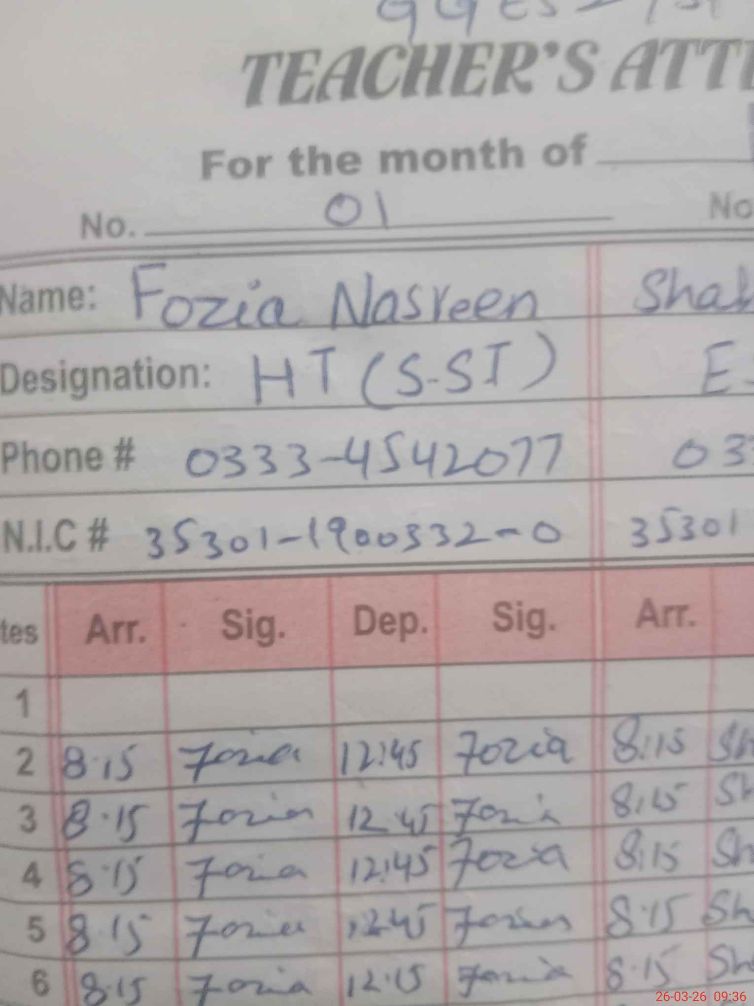 | Name: Fo**** Designation: (School Headmaster's/Headmistress's) SST ARTS Phone/Cell Number: 03**** |