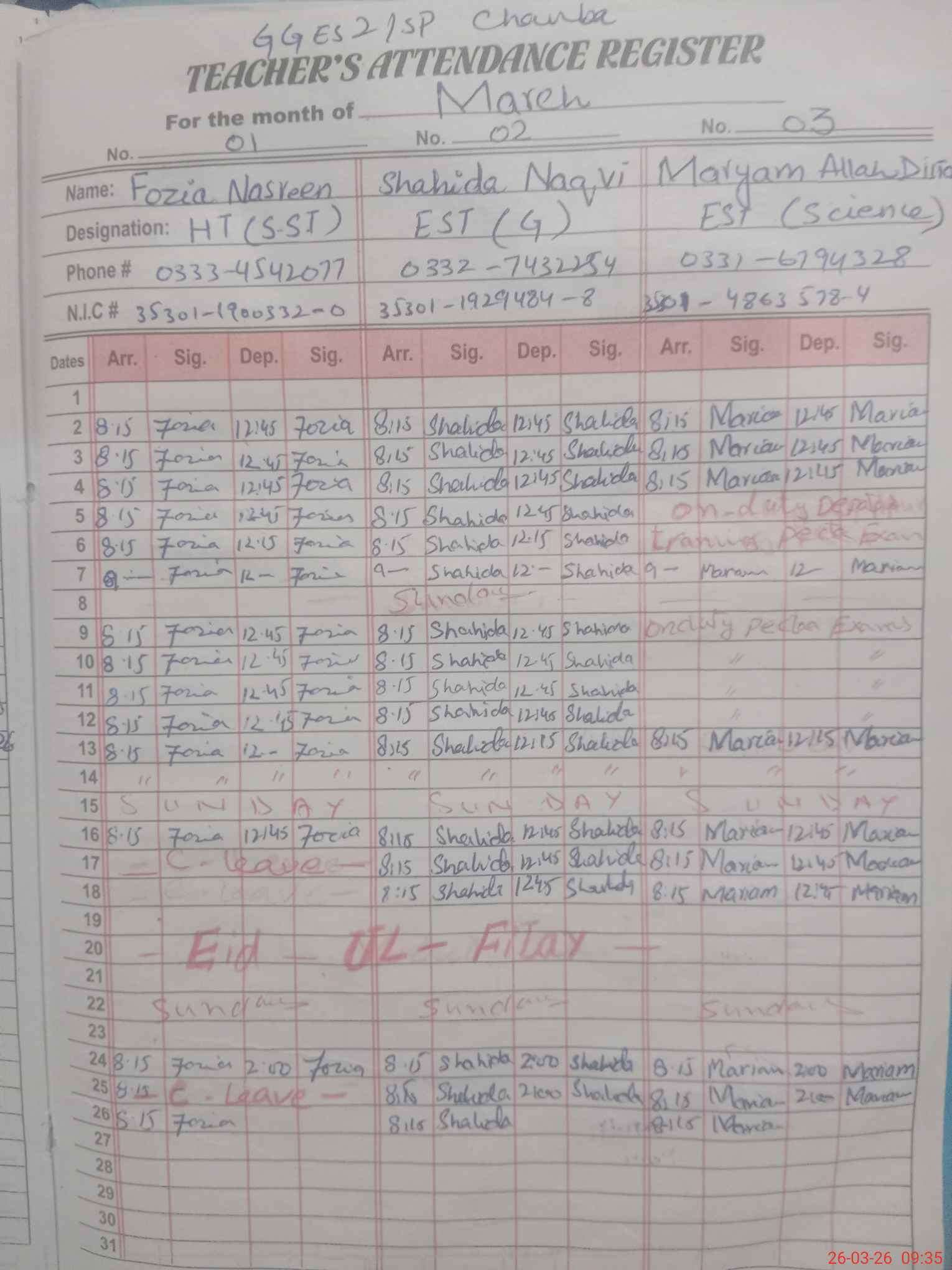 | CNIC | Full Name | Designation | R/C | Absence During Last Calender Month |