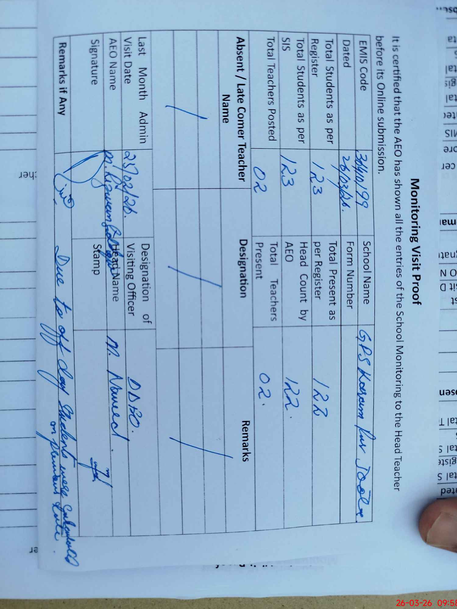 | Attendance Register | Head Teacher | MEA with School | Visit Proof |