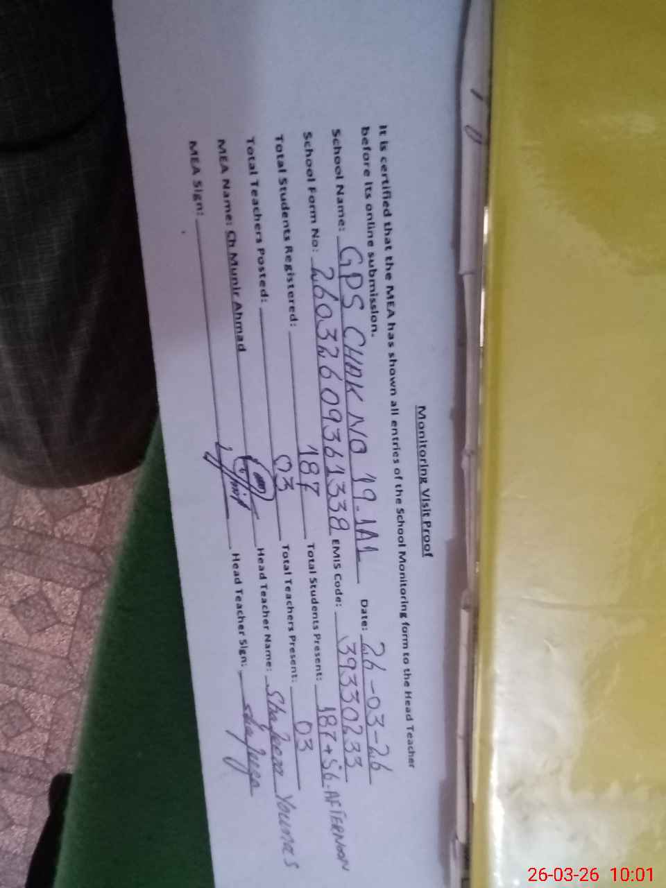 | Attendance Register | Head Teacher | MEA with School | Visit Proof |