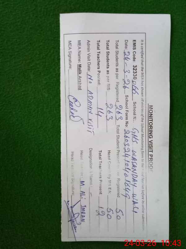 | EMIS Code: 32330066 | Name of School: GHS WASANDAY WALI | |||