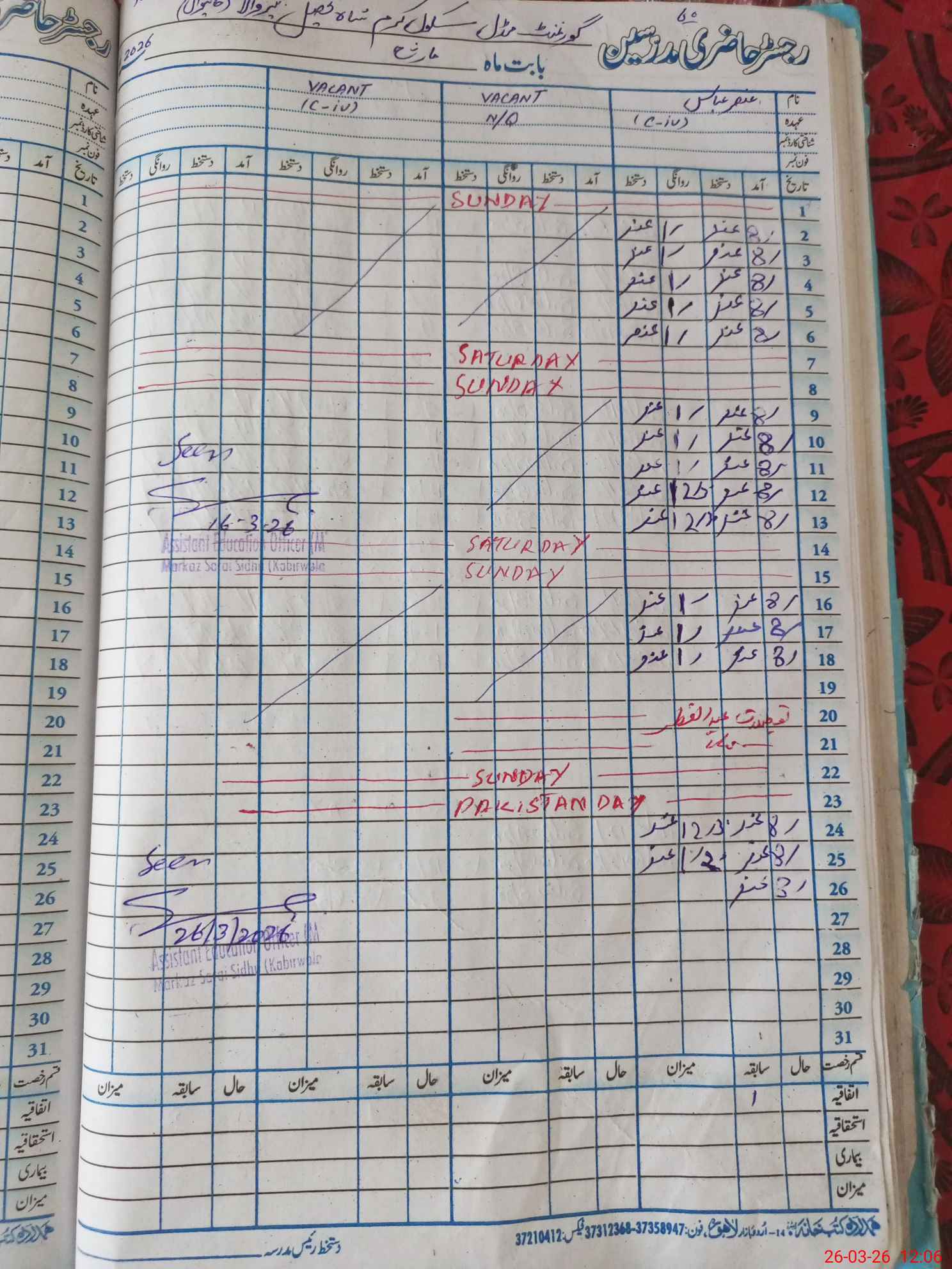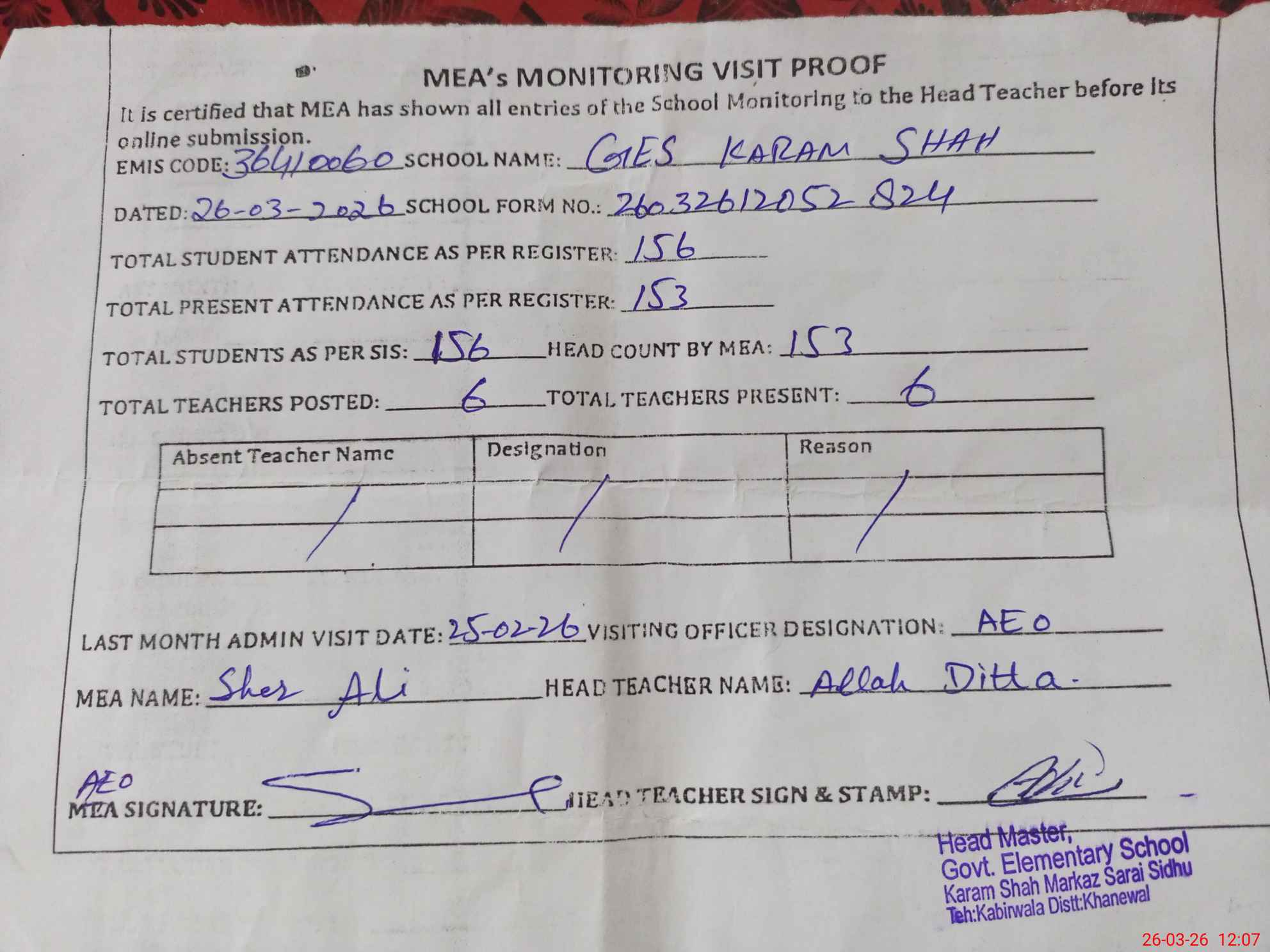 | Attendance Register | Head Teacher | MEA with School | Visit Proof |