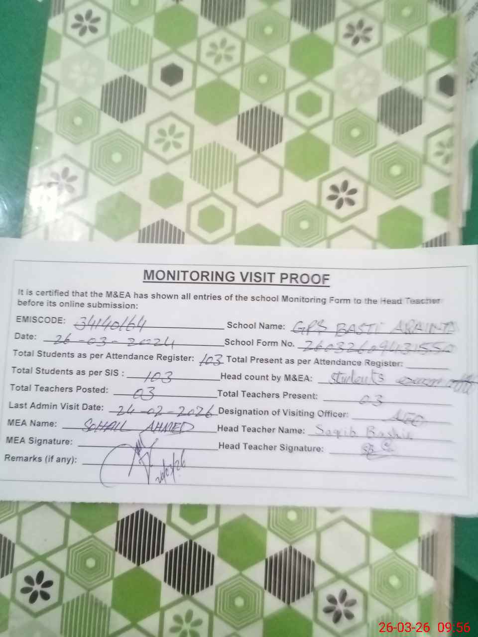 | EMIS Code: 34140164 | Name of School: GPS BASTI ARAIAN | |||