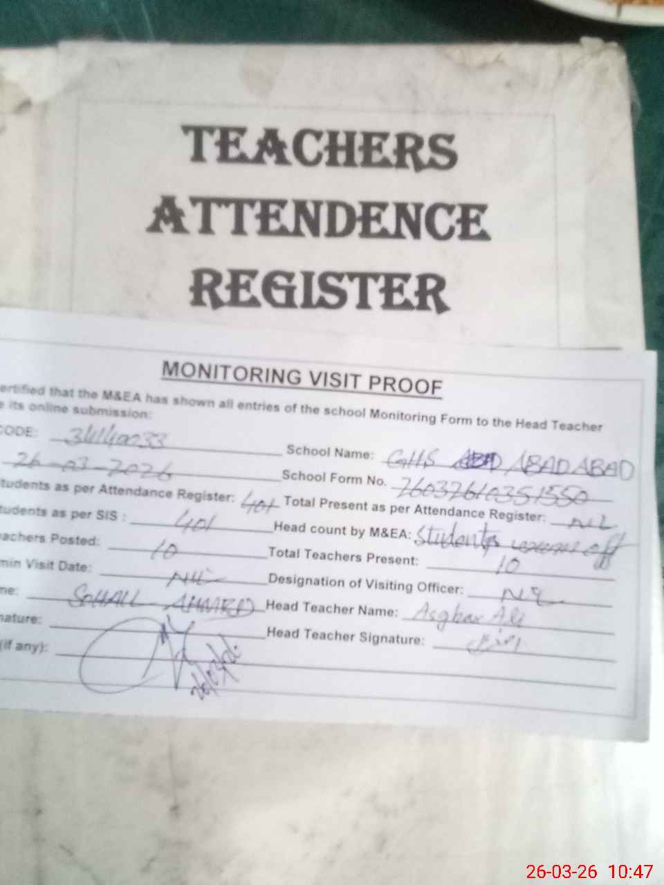 | Attendance Register | Head Teacher | MEA with School | Visit Proof |