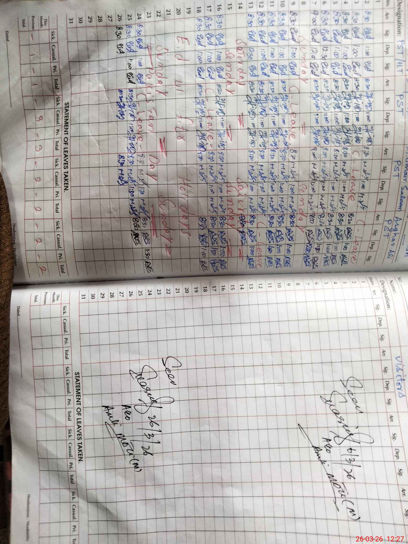 | Leave | Duty | Absent | Maternity | Medical | Ex- Pak |