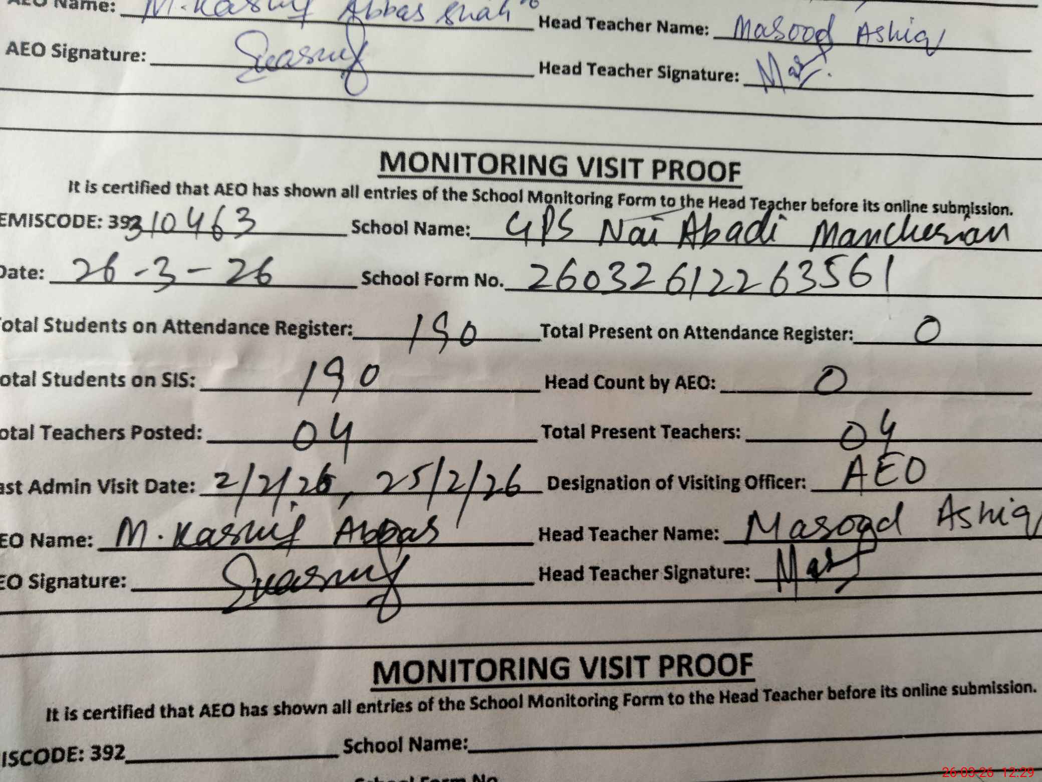 | Attendance Register | Head Teacher | MEA with School | Visit Proof |
