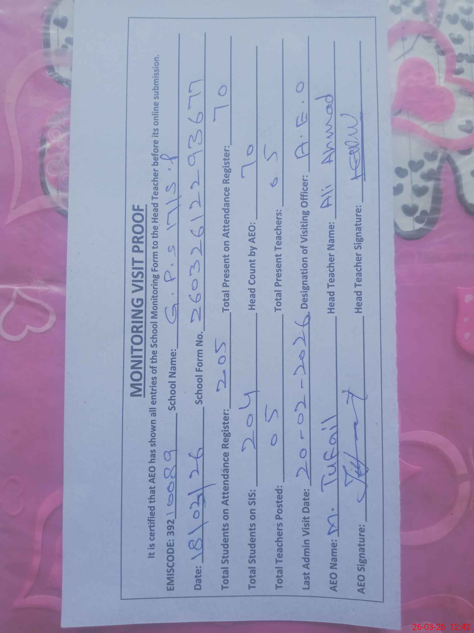 | EMIS Code: 39210089 | Name of School: GPS 17/SP P.O PAKPATTAN | |||