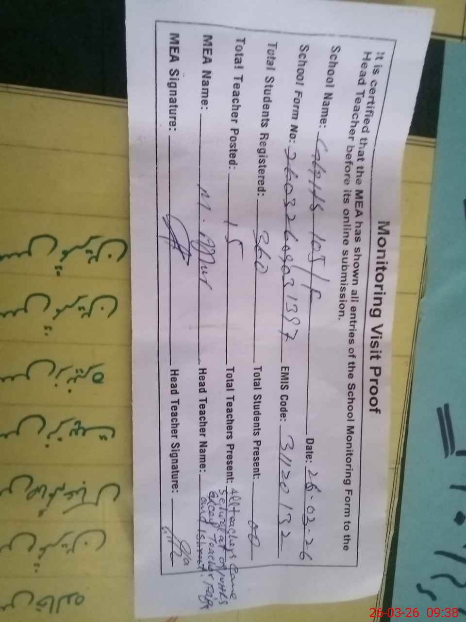 | Attendance Register | Head Teacher | MEA with School | Visit Proof |