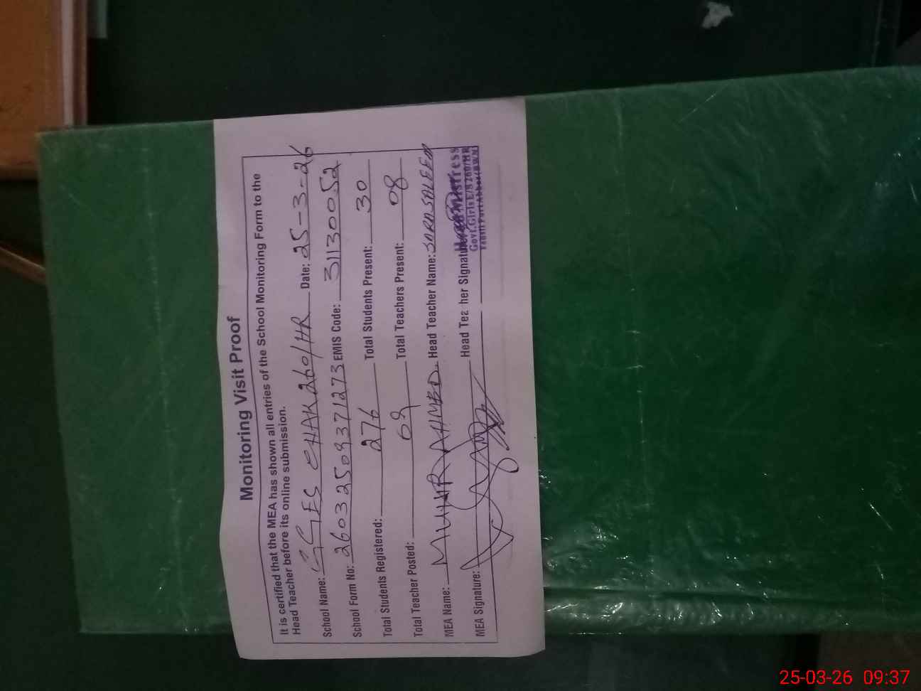 | Attendance Register | Head Teacher | MEA with School | Visit Proof |