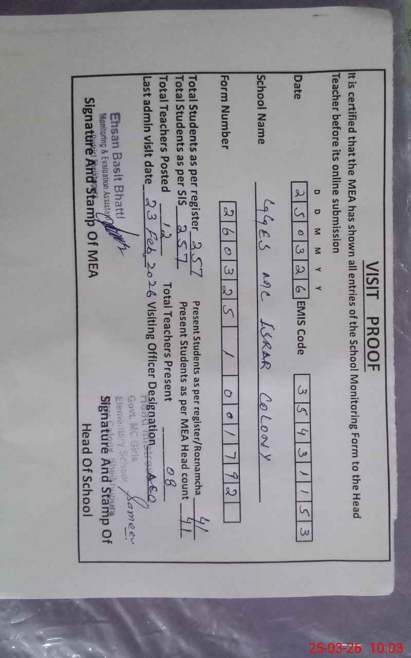 | EMIS Code: 35431153 | Name of School: GGES MC ISRAR COLONY | |||
