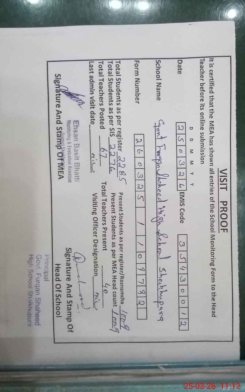 | EMIS Code: 35430012 | Name of School: GOVT. FURQAN SHAHEED HIGH SCHOOL SHEIKHUPURA | |||