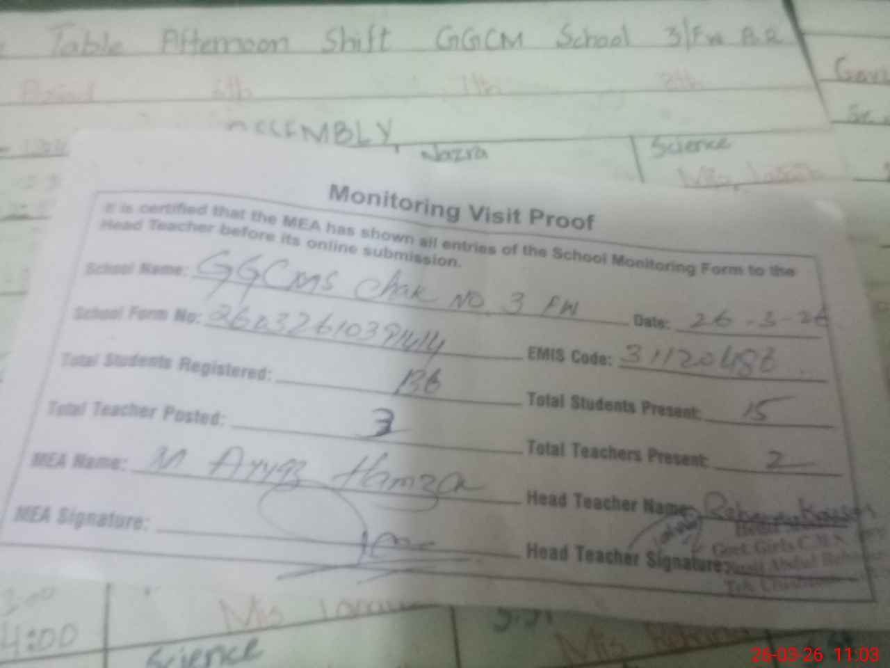 | Attendance Register | Head Teacher | MEA with School | Visit Proof |