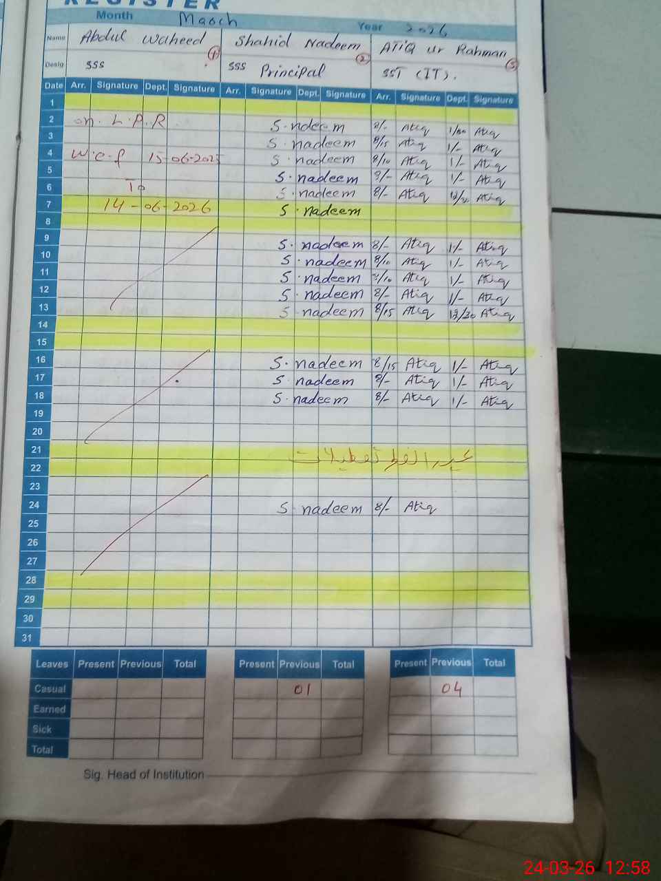 | CNIC | Full Name | Designation | R/C | Absence During Last Calender Month |