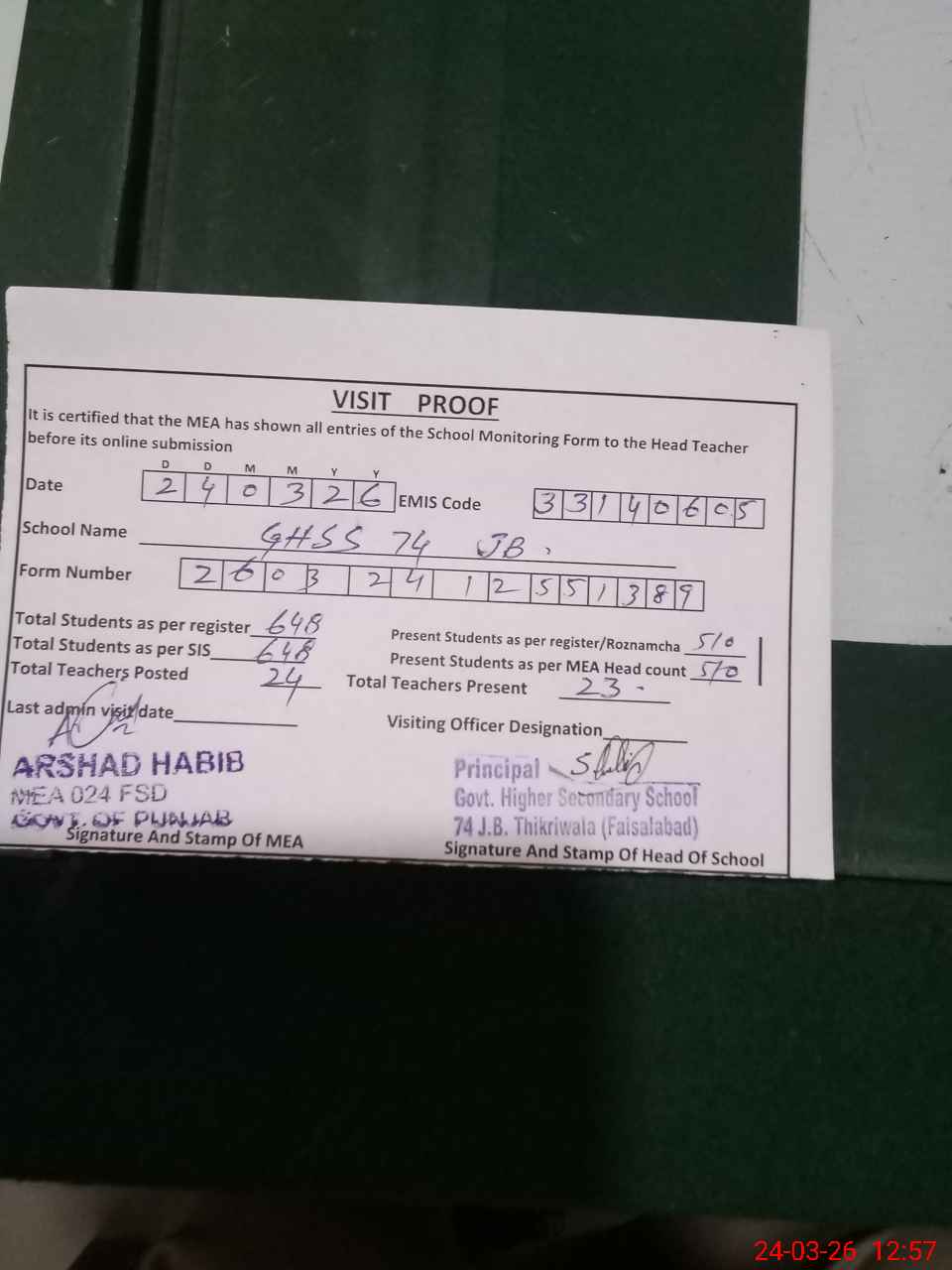 | Attendance Register | Head Teacher | MEA with School | Visit Proof |
