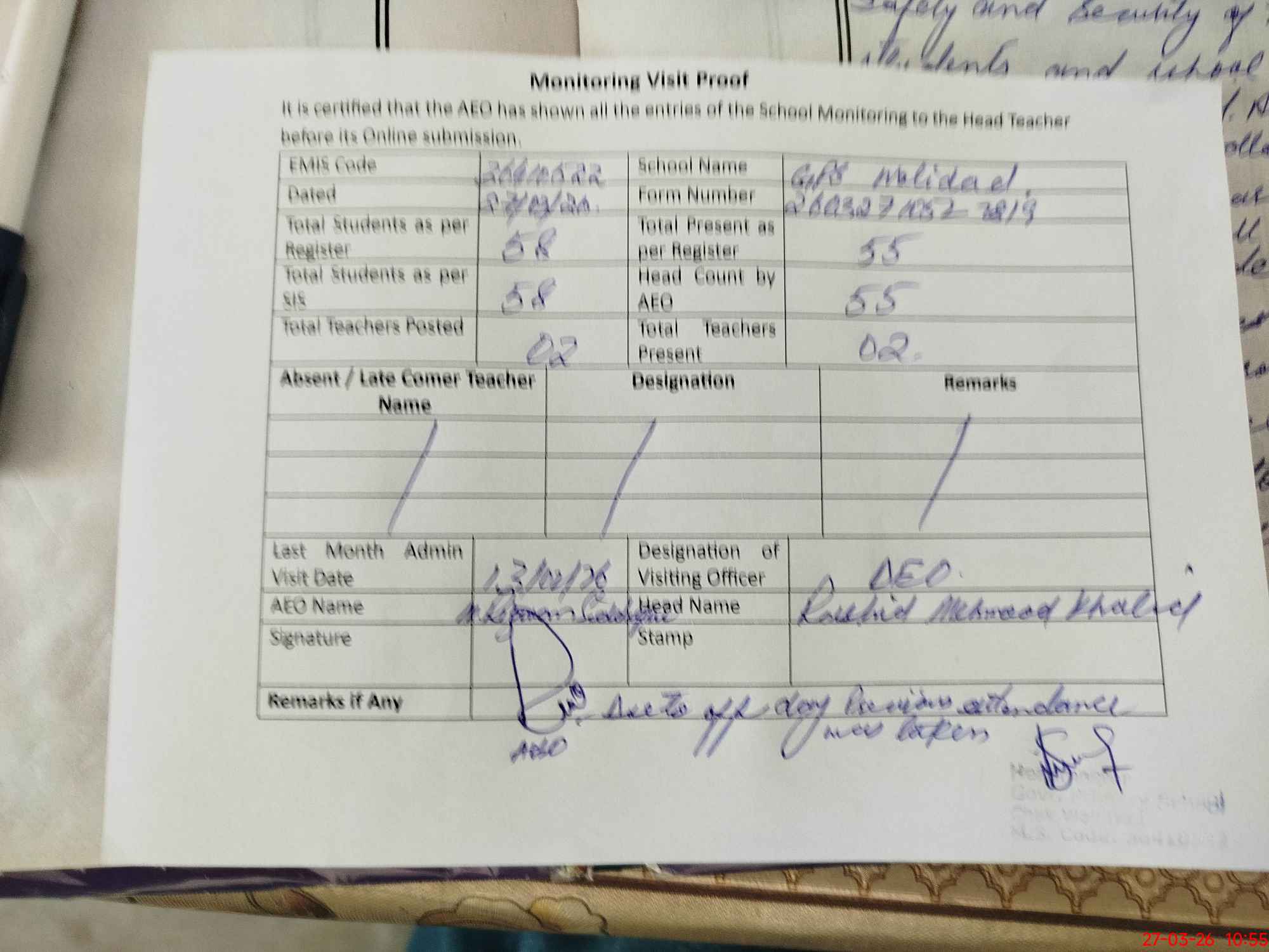 | Attendance Register | Head Teacher | MEA with School | Visit Proof |