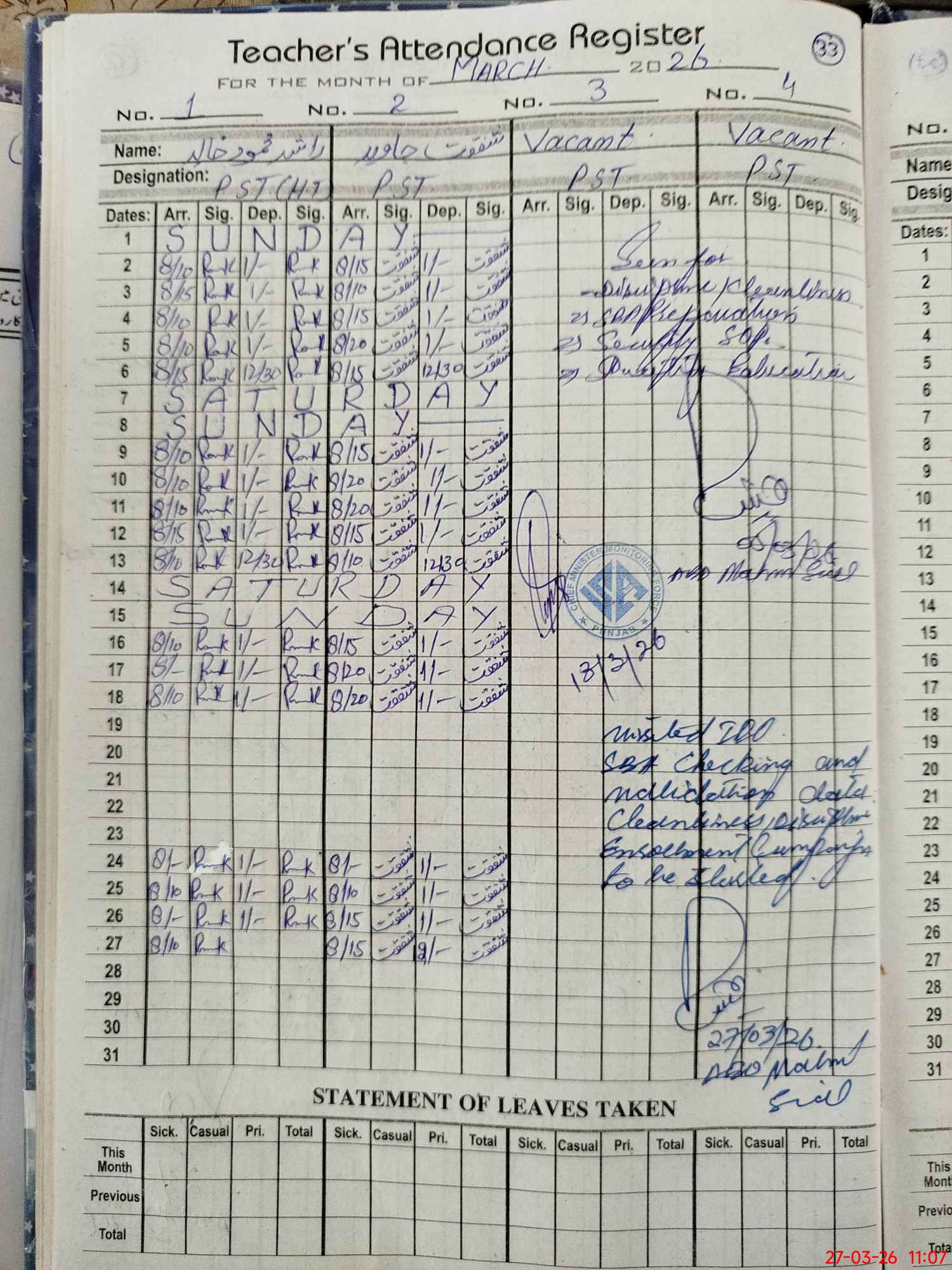 | Monitoring Date: 27-03-2026 | Start Time: 27-03-2026 10:46 AM | End Time: 27-03-2026 11:08 AM | Name of MEA: MU**** RI**** SI**** | |