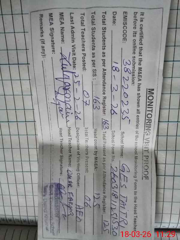 | Attendance Register | Head Teacher | MEA with School | Visit Proof |