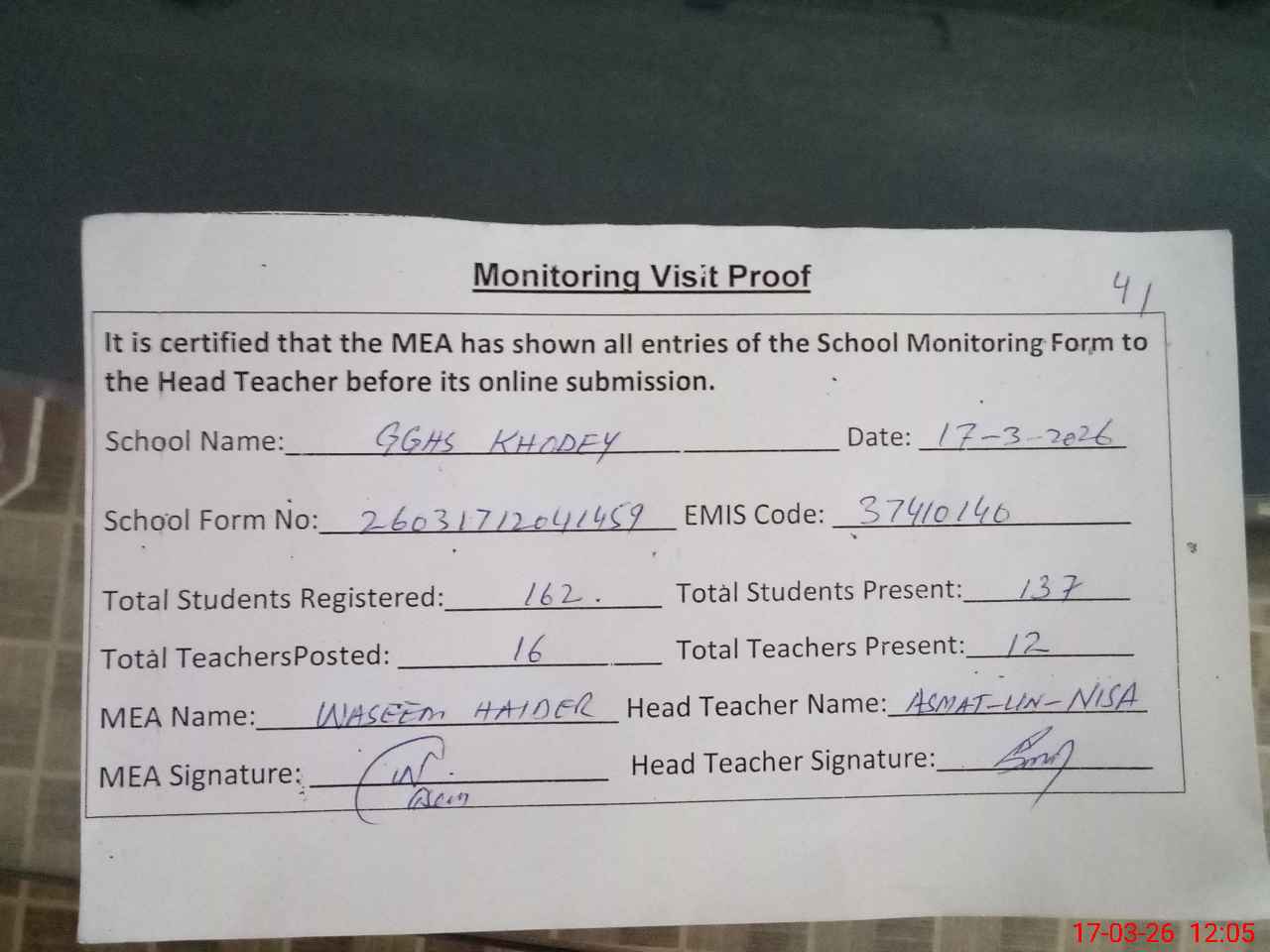 | EMIS Code: 37410140 | Name of School: GGHS KHODEY | |||