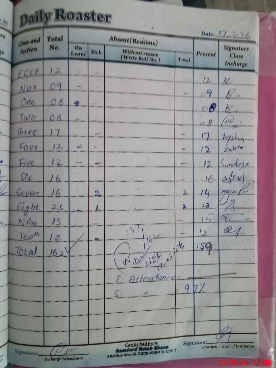 | Remarks (Use Separate Page if Required): class ece and kachi was not present today due to paper schedule no paper Est Ayesha name was not shown on mea tab | |||||