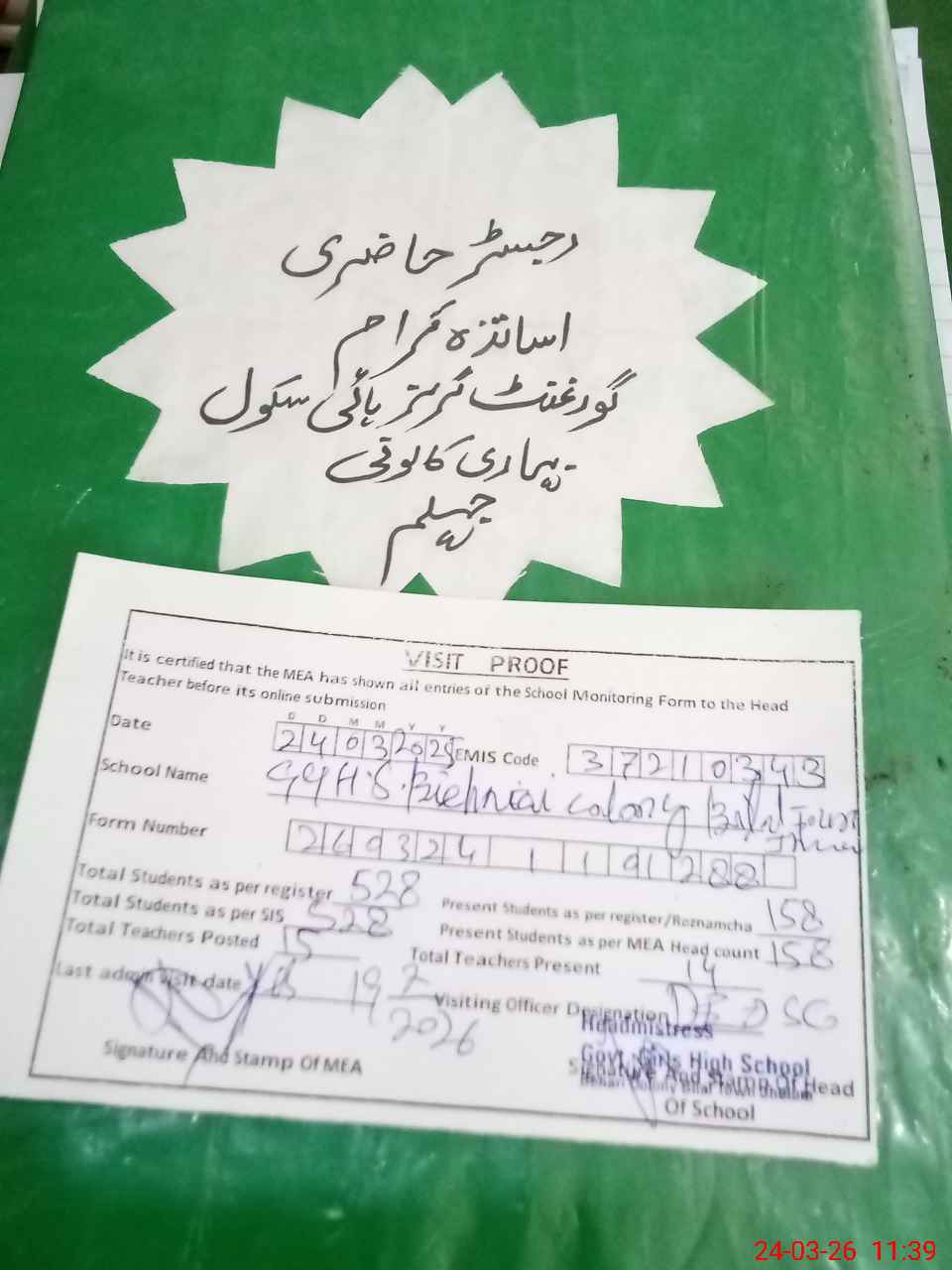 | EMIS Code: 37210248 | Name of School: GGHS BIEHRAI COLONY BILAL TOWN | |||