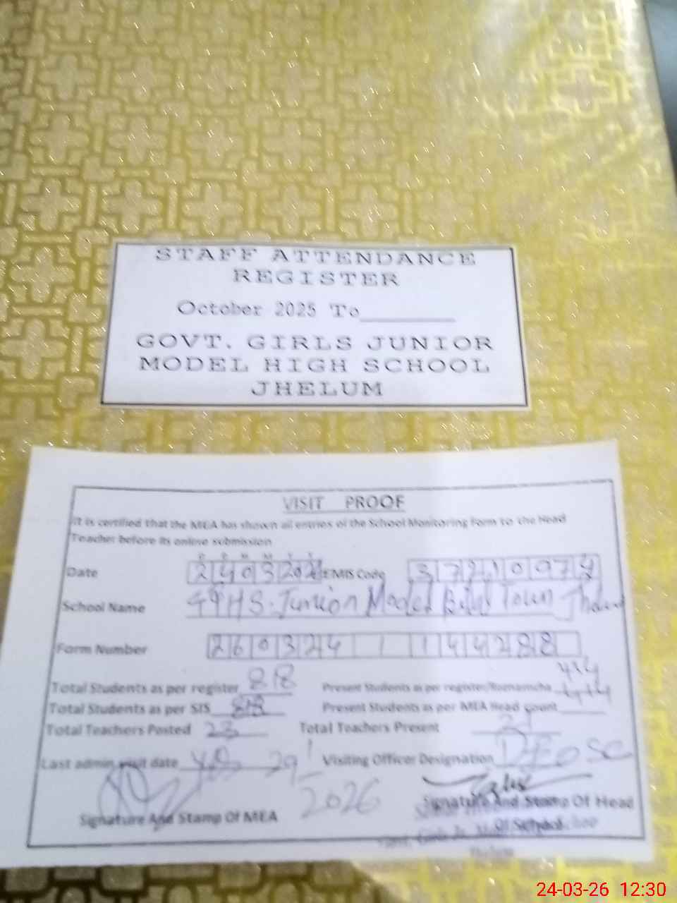 | EMIS Code: 37210074 | Name of School: GGHS JUNIOR MODEL BILAL TOWN JHELUM | |||