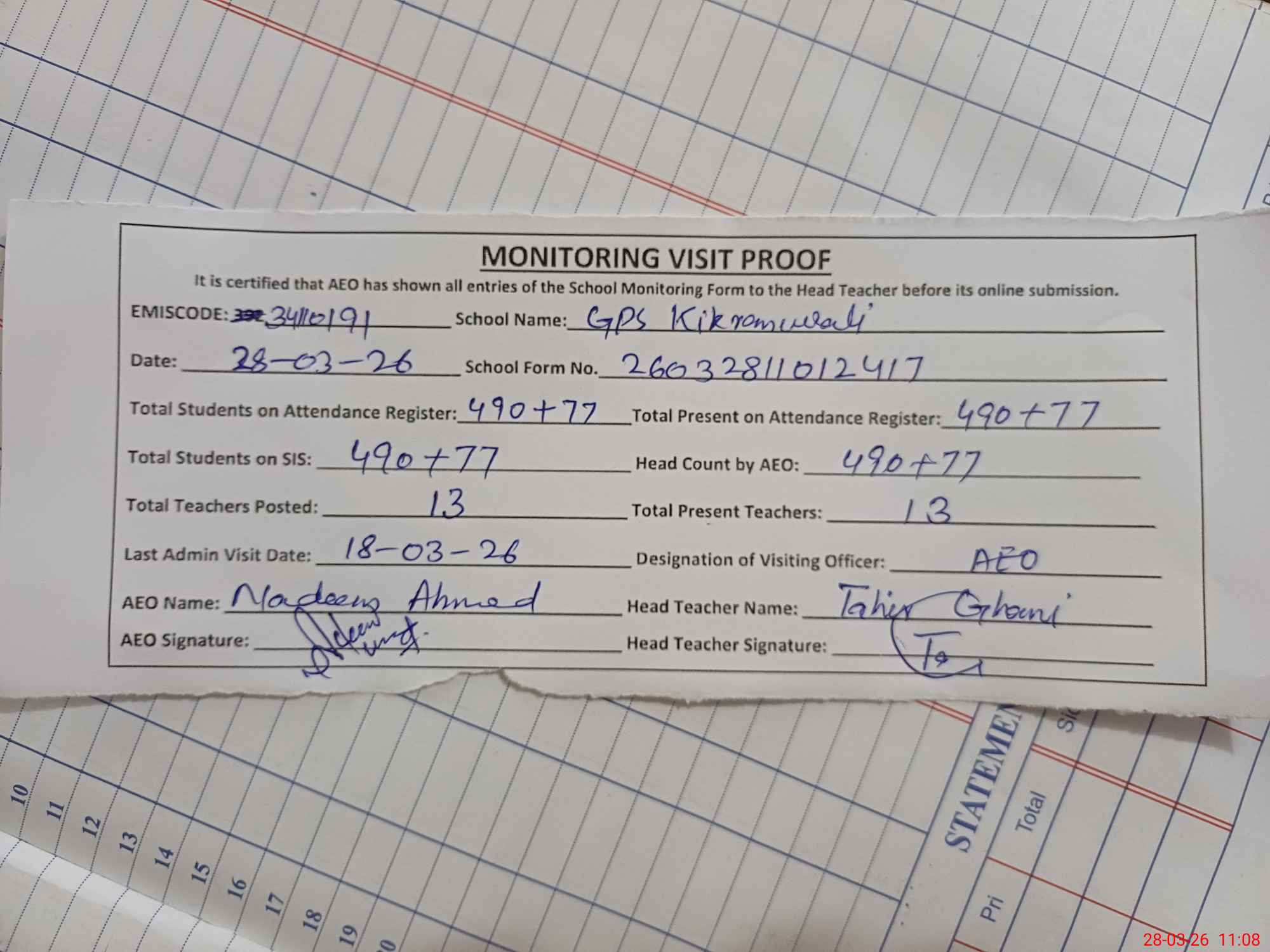 | Attendance Register | Head Teacher | MEA with School | Visit Proof |