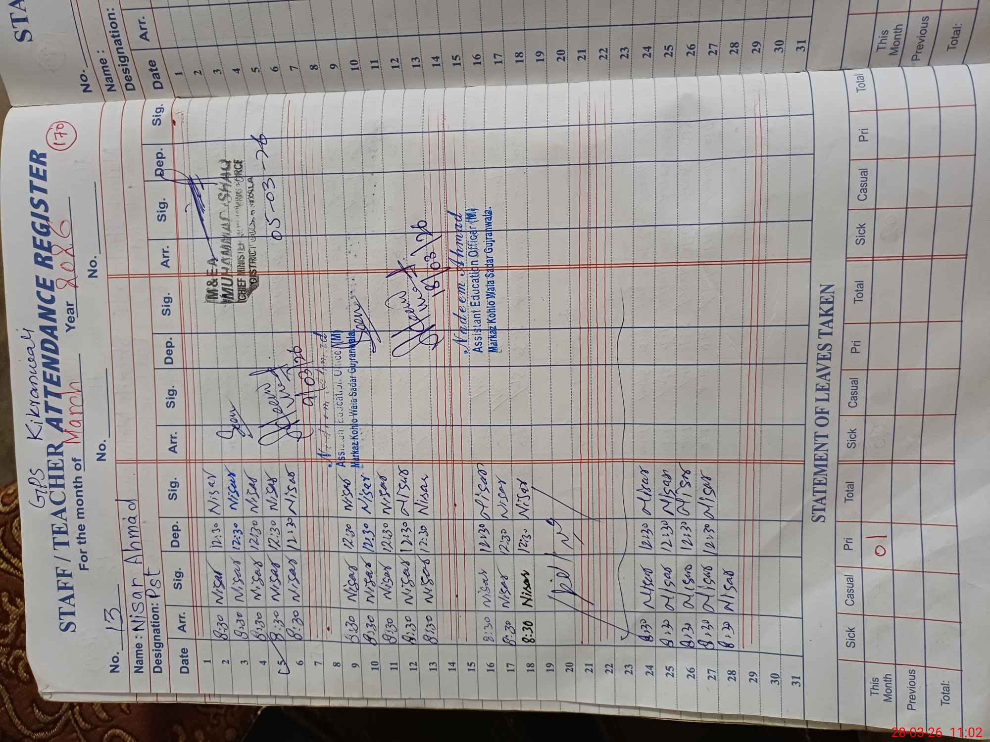 | Name: TA**** GH**** Designation: (School Headmaster's/Headmistress's) PST Phone/Cell Number: 03**** |