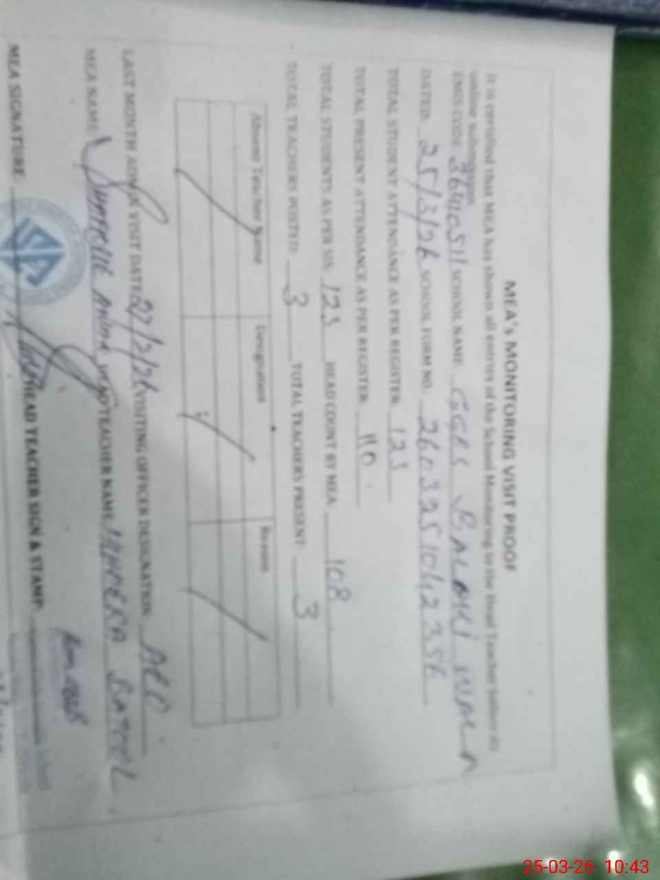 | Attendance Register | Head Teacher | MEA with School | Visit Proof |