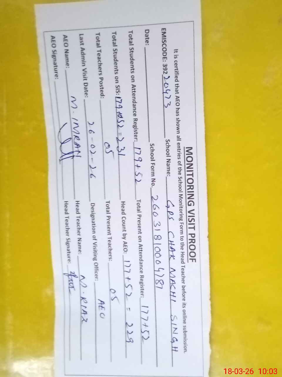 | EMIS Code: 39220473 | Name of School: GPS CHAK MACHI SINGH | |||