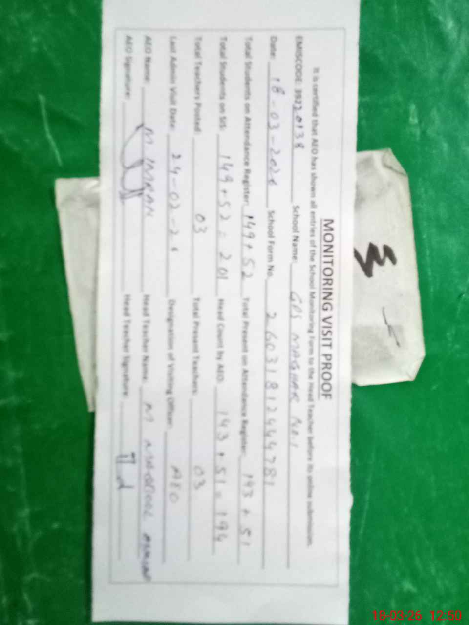 | Attendance Register | Head Teacher | MEA with School | Visit Proof |