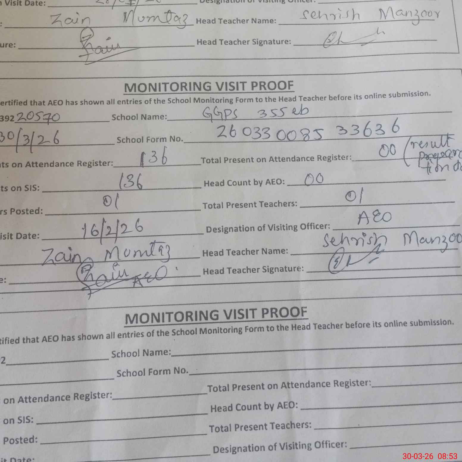 | Monitoring Date: 30-03-2026 | Start Time: 30-03-2026 08:36 AM | End Time: 30-03-2026 08:53 AM | Name of MEA: Za**** Mu**** | |