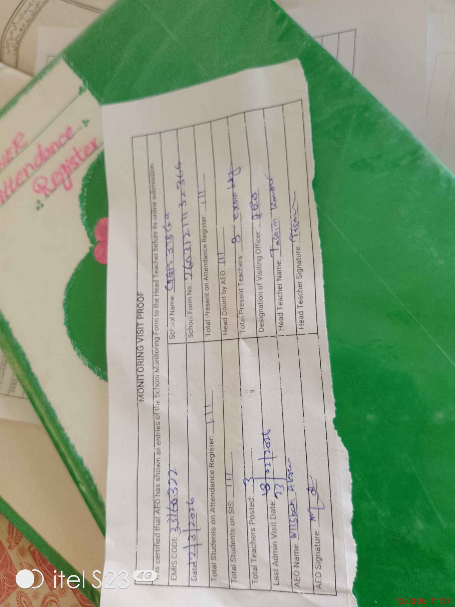 | Attendance Register | Head Teacher | MEA with School | Visit Proof |