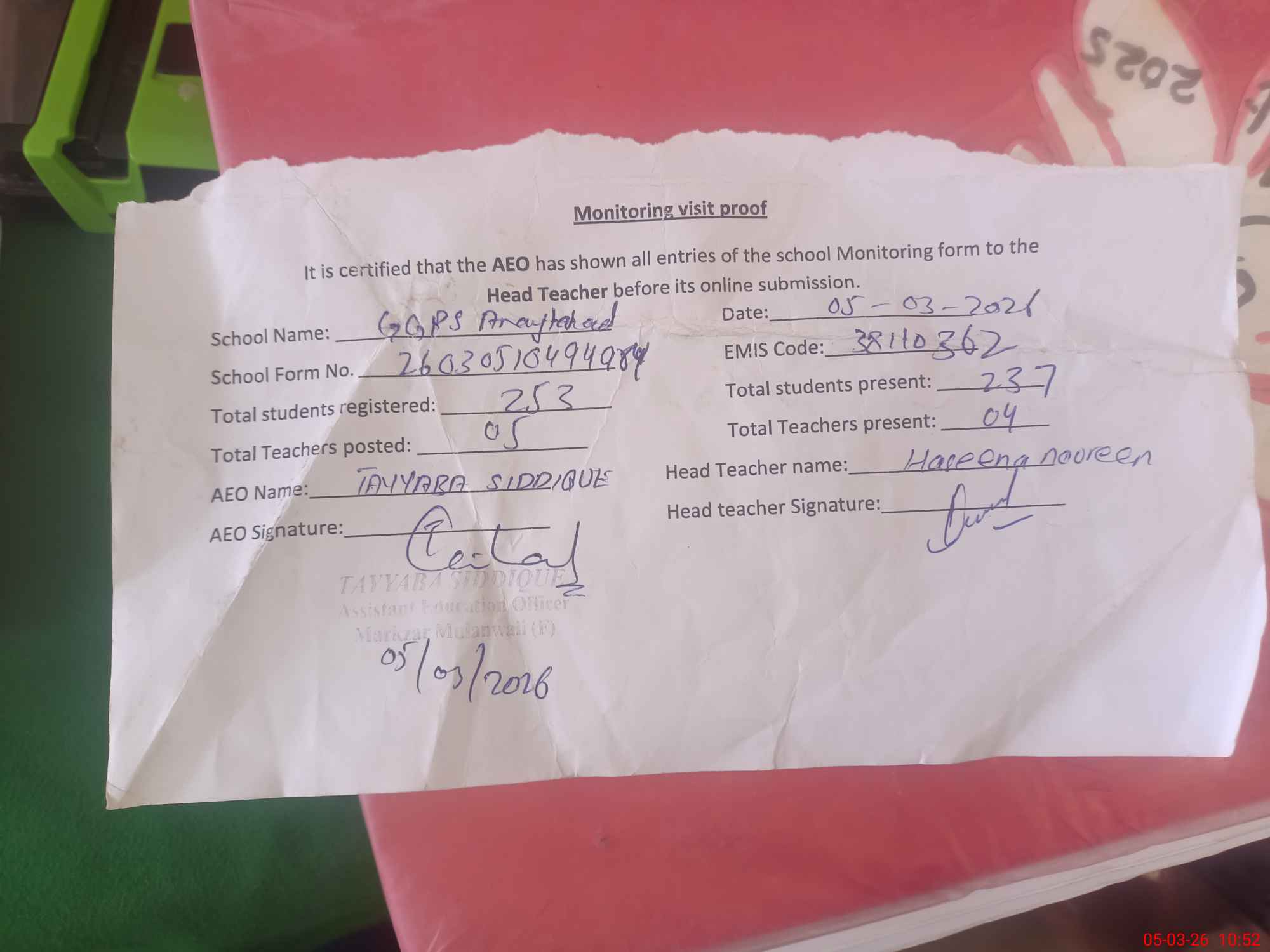 | Certified that this School was Inspected by the Undersigned MEA/DMO Today and the Information Stated Above is as Per Record. | |||||