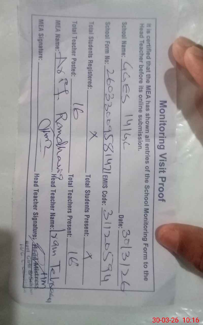 | Attendance Register | Head Teacher | MEA with School | Visit Proof |