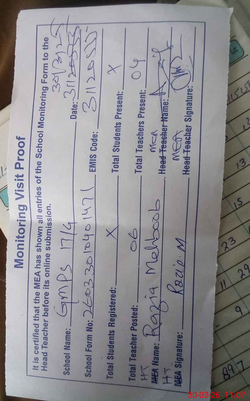 | Attendance Register | Head Teacher | MEA with School | Visit Proof |