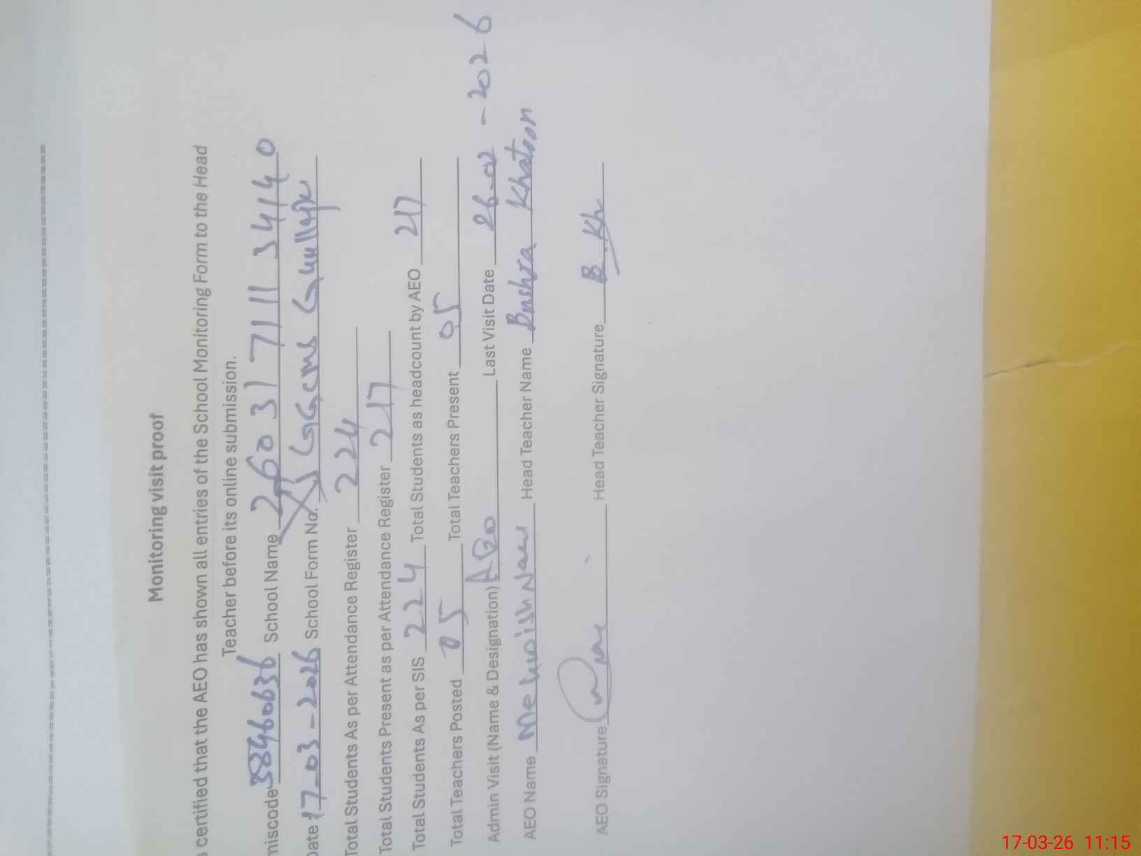 | Attendance Register | Head Teacher | MEA with School | Visit Proof |