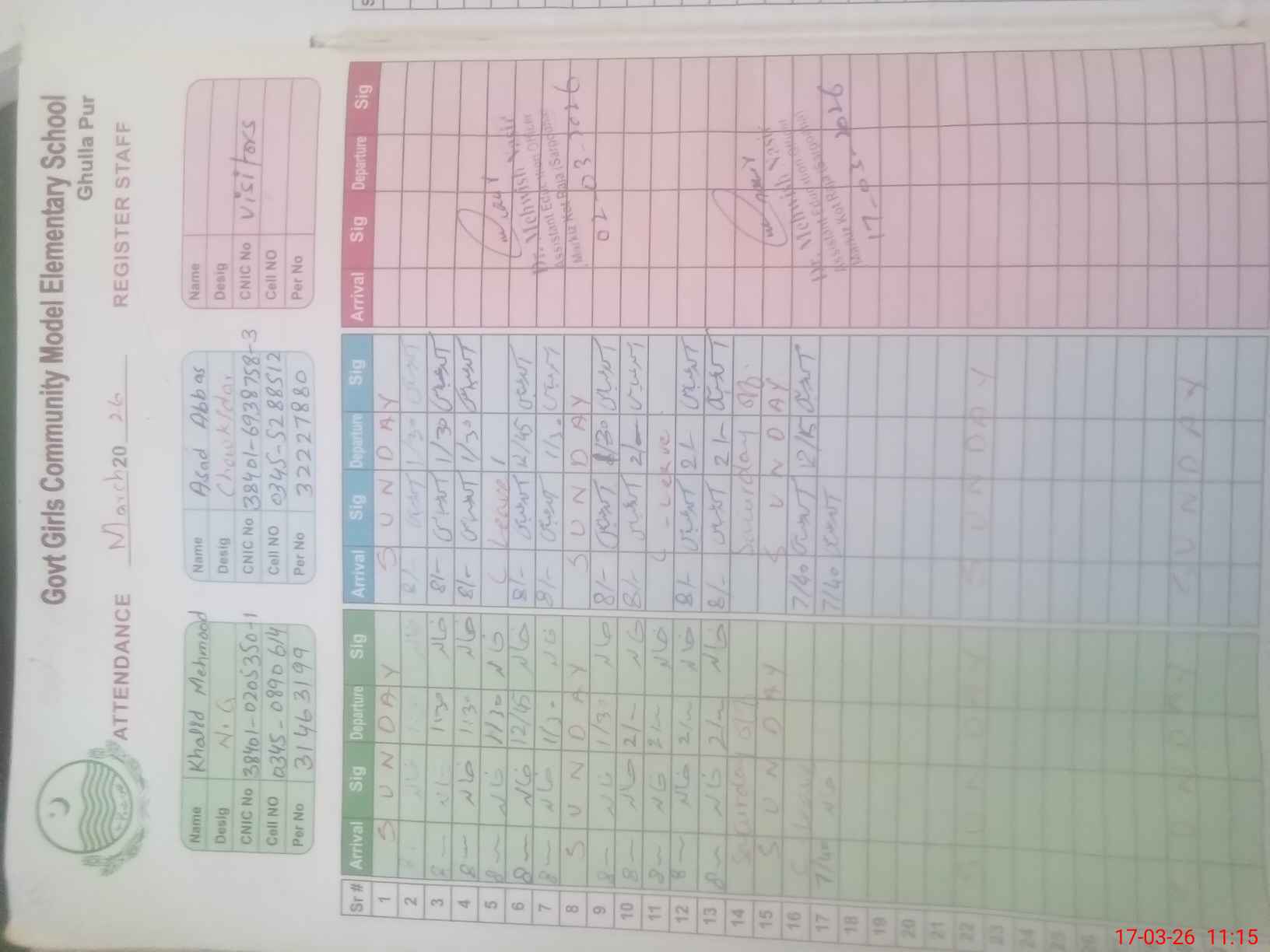 | CNIC | Full Name | Designation | R/C | Absence During Last Calender Month |
