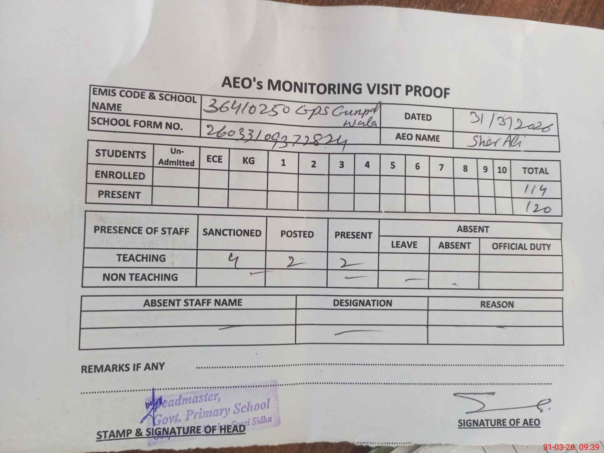 | EMIS Code: 36410250 | Name of School: GPS GUNPAL WALA, MOUZA HAVELI MUBARAK SHAH, SARAI SIDHU | |||