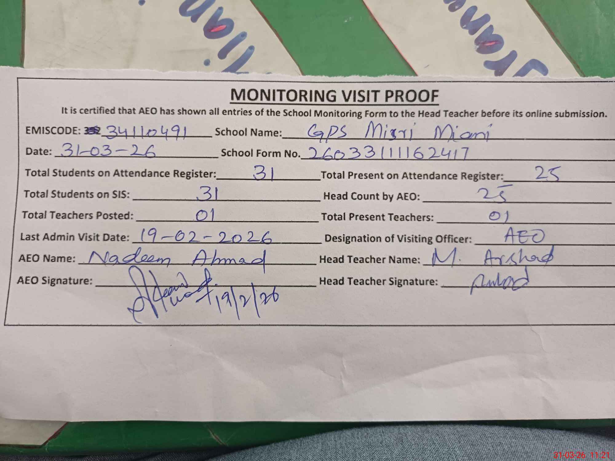 | Attendance Register | Head Teacher | MEA with School | Visit Proof |