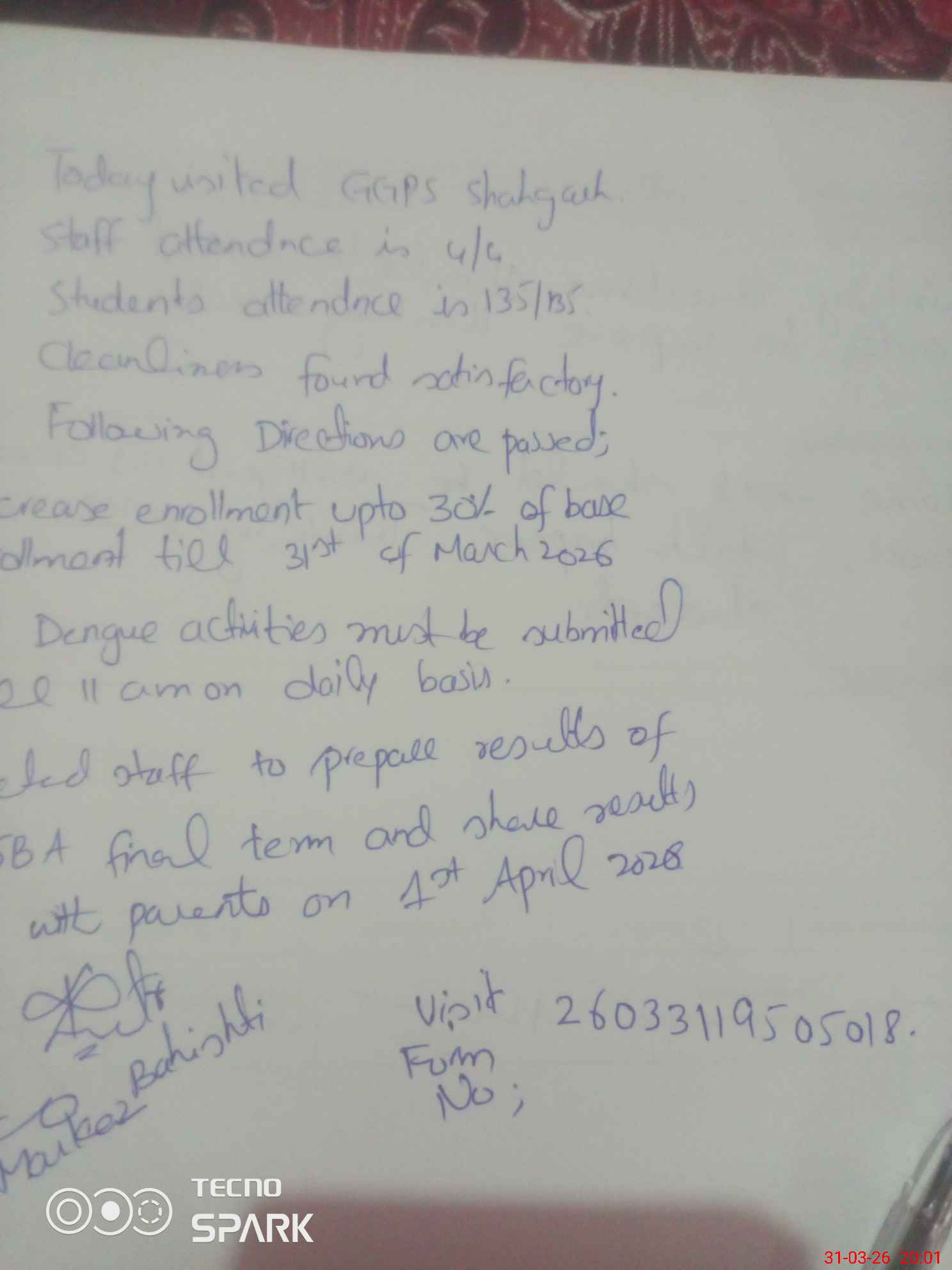 | Attendance Register | Head Teacher | MEA with School | Visit Proof |