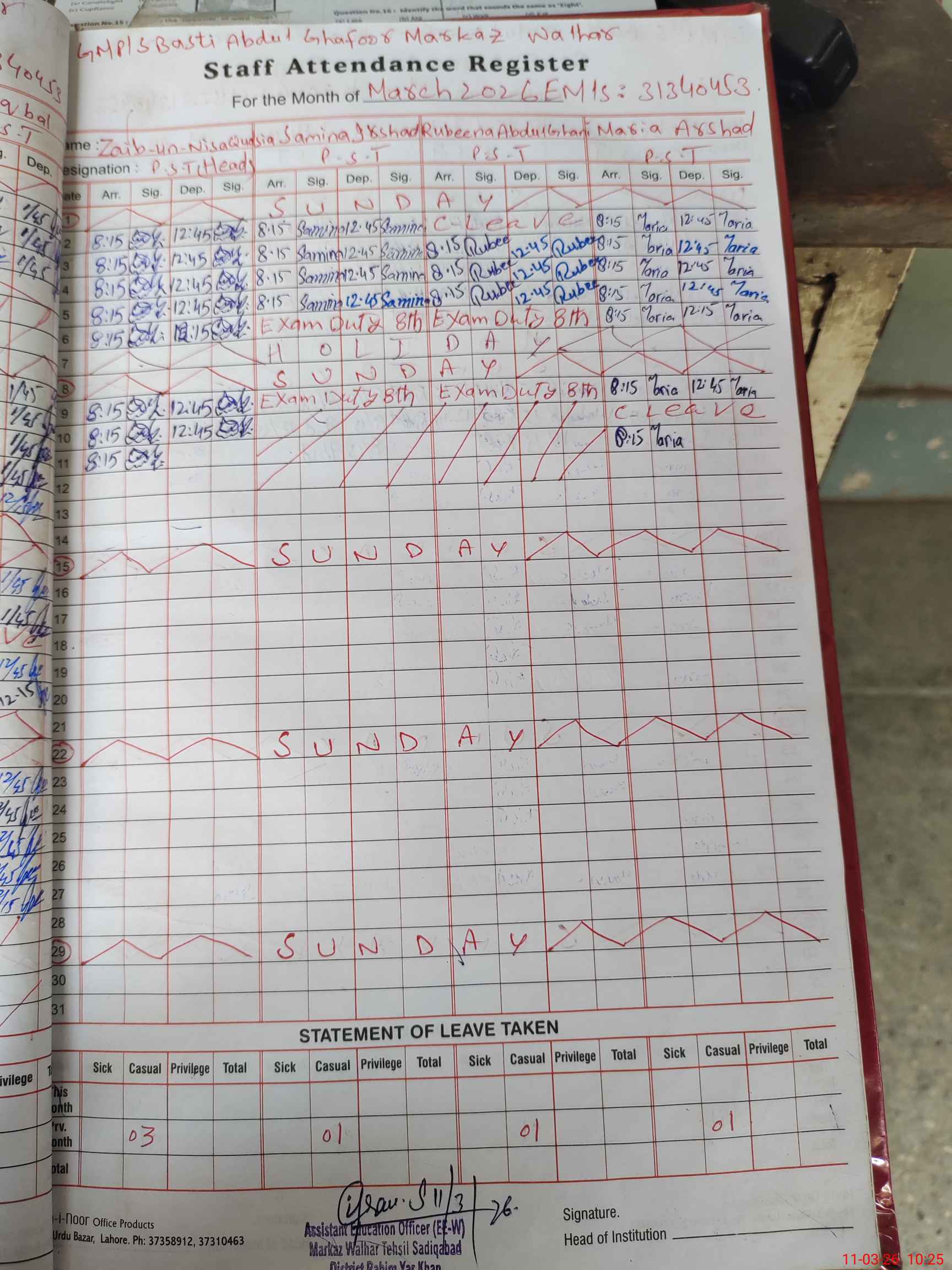 | 31**** | Ru**** Ab**** | PST Arts | Regular | 0 | 0 | 0 | 0 | 0 | 0 | 0 | 0 | 0 | Exam Duty |