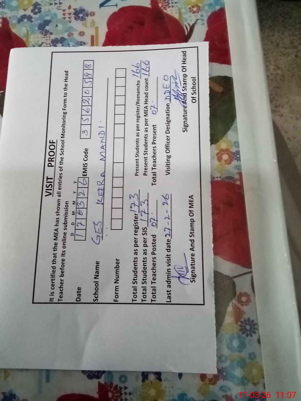 | Certified that this School was Inspected by the Undersigned MEA/DMO Today and the Information Stated Above is as Per Record. | |||||