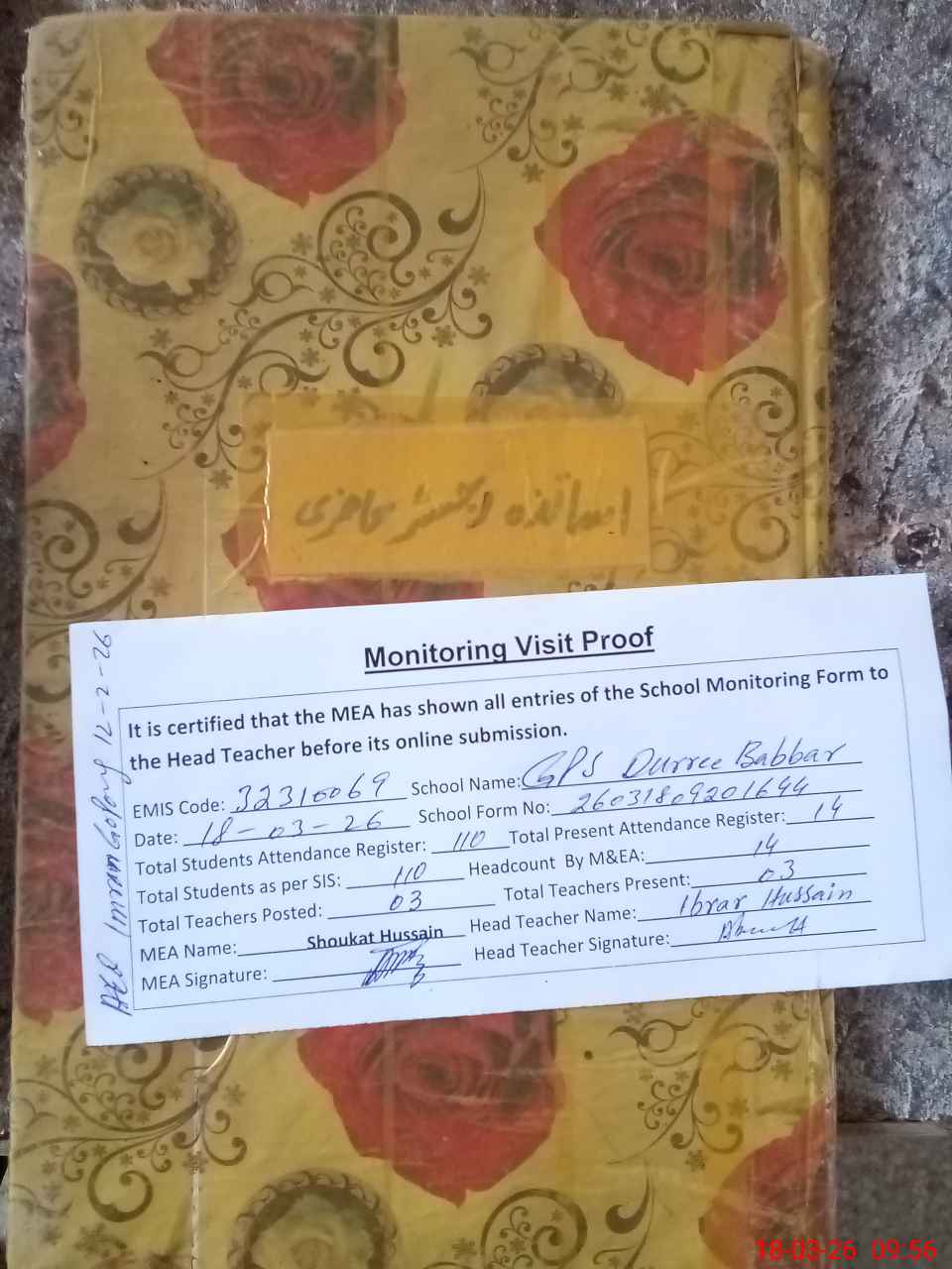 | Attendance Register | Head Teacher | MEA with School | Visit Proof |