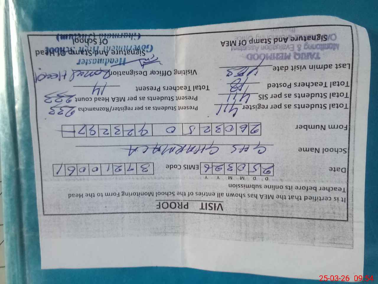 | Attendance Register | Head Teacher | MEA with School | Visit Proof |
