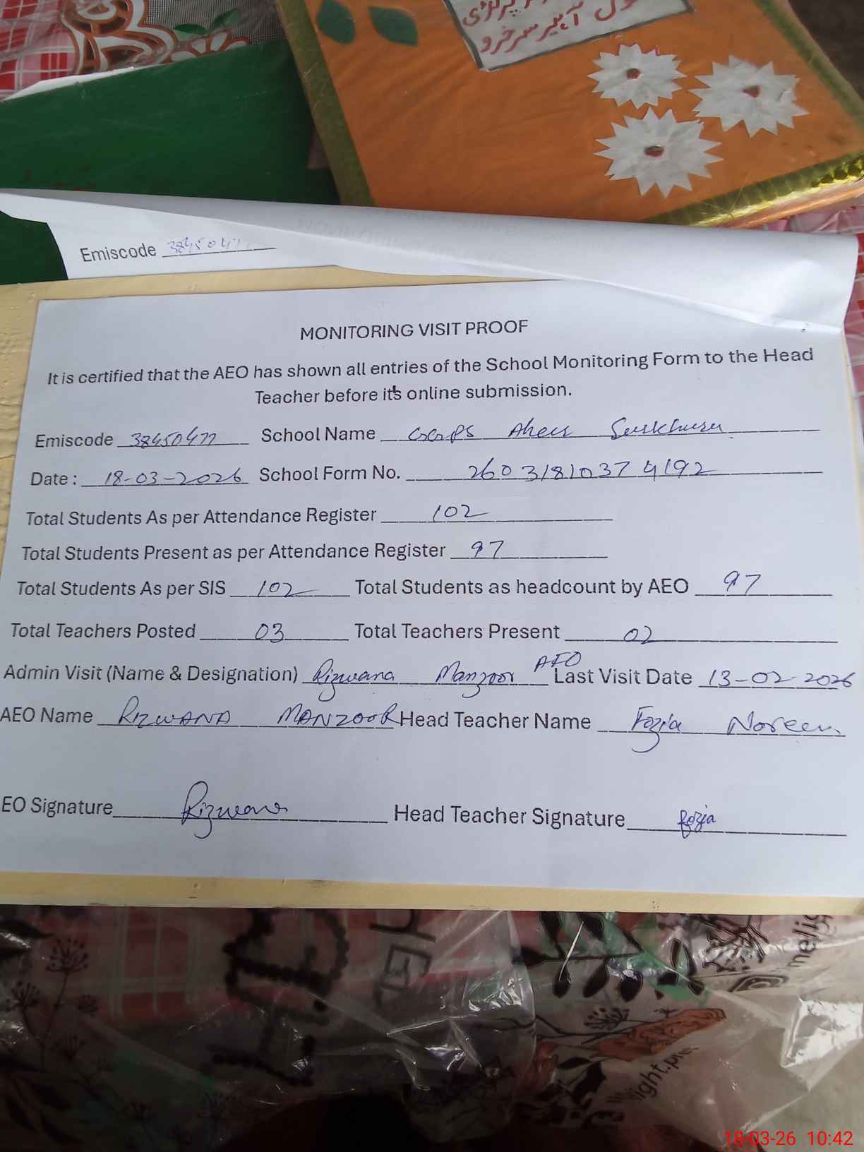 | Attendance Register | Head Teacher | MEA with School | Visit Proof |