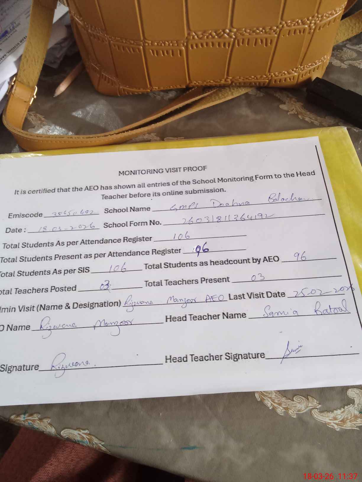 | Attendance Register | Head Teacher | MEA with School | Visit Proof |